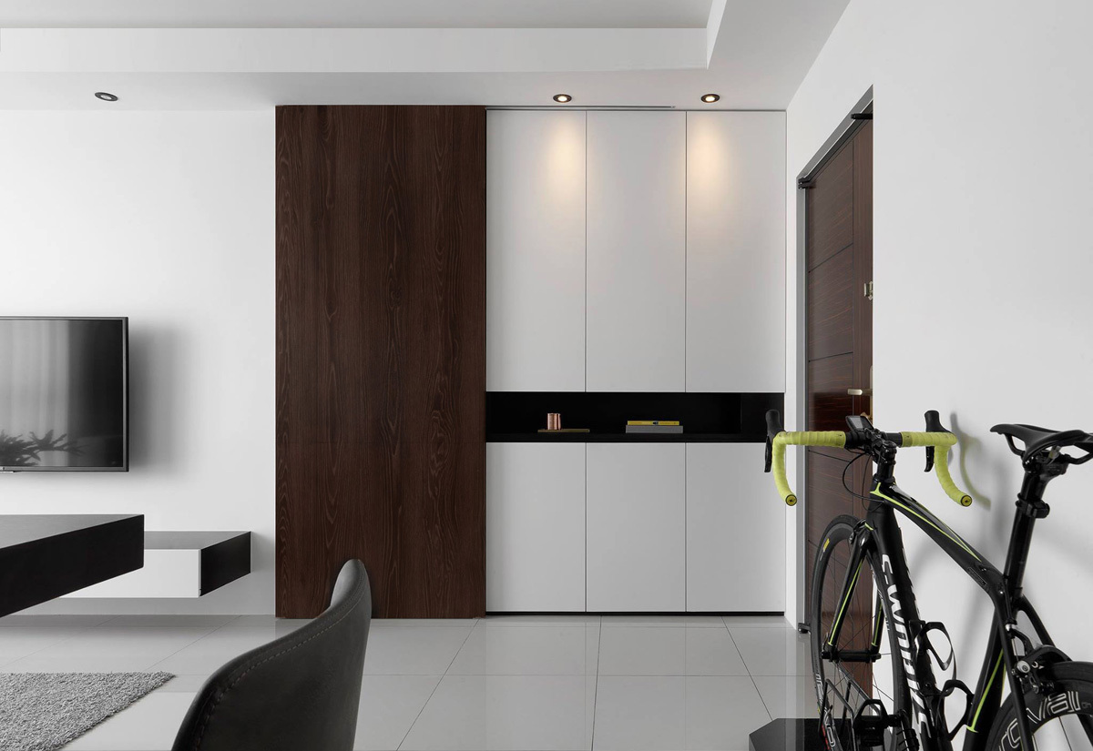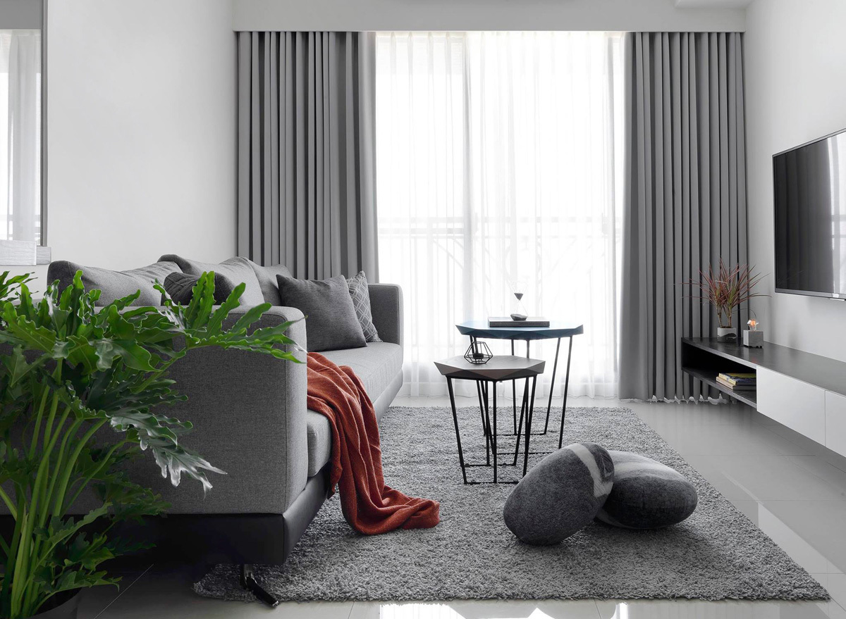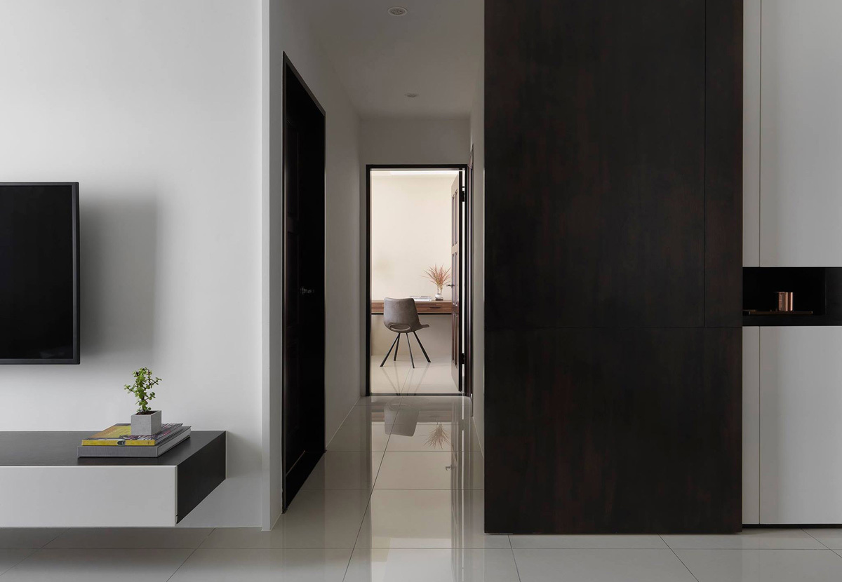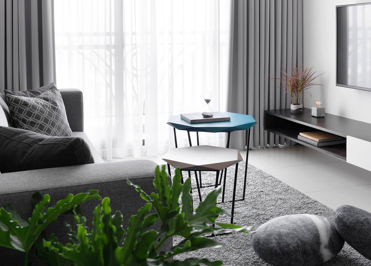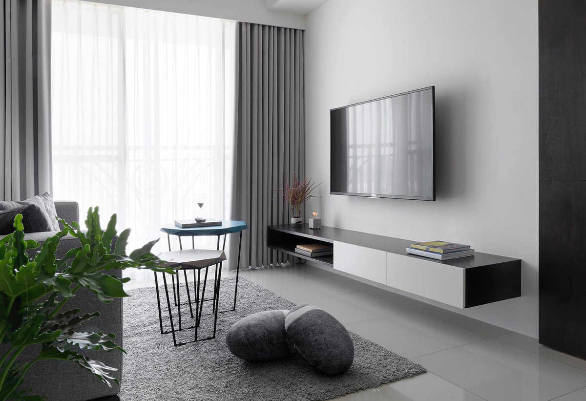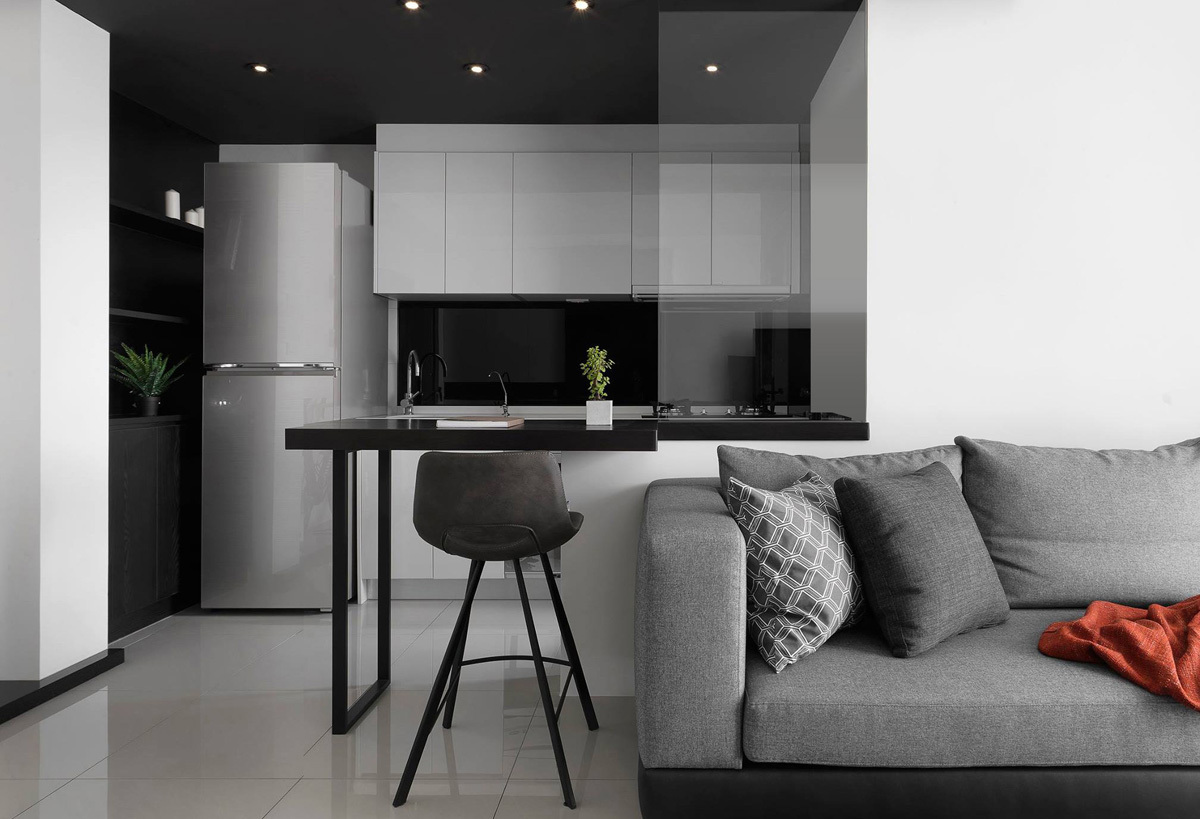 Дизайн квартиры выполнен в серых тонах. Основные цвета в проекте монохромные, темно-белый. Концепция строится на разности фактур и на цветовых нюансах. Где черный цвет - это и темно серый и графитовый; Белый это и чистый белый глянец - в поддержку ему белый мрамор и оттенки белого на стенах. На полу в прихожей : серый натуральный сланец с покрытием эффекта мокрого камня.