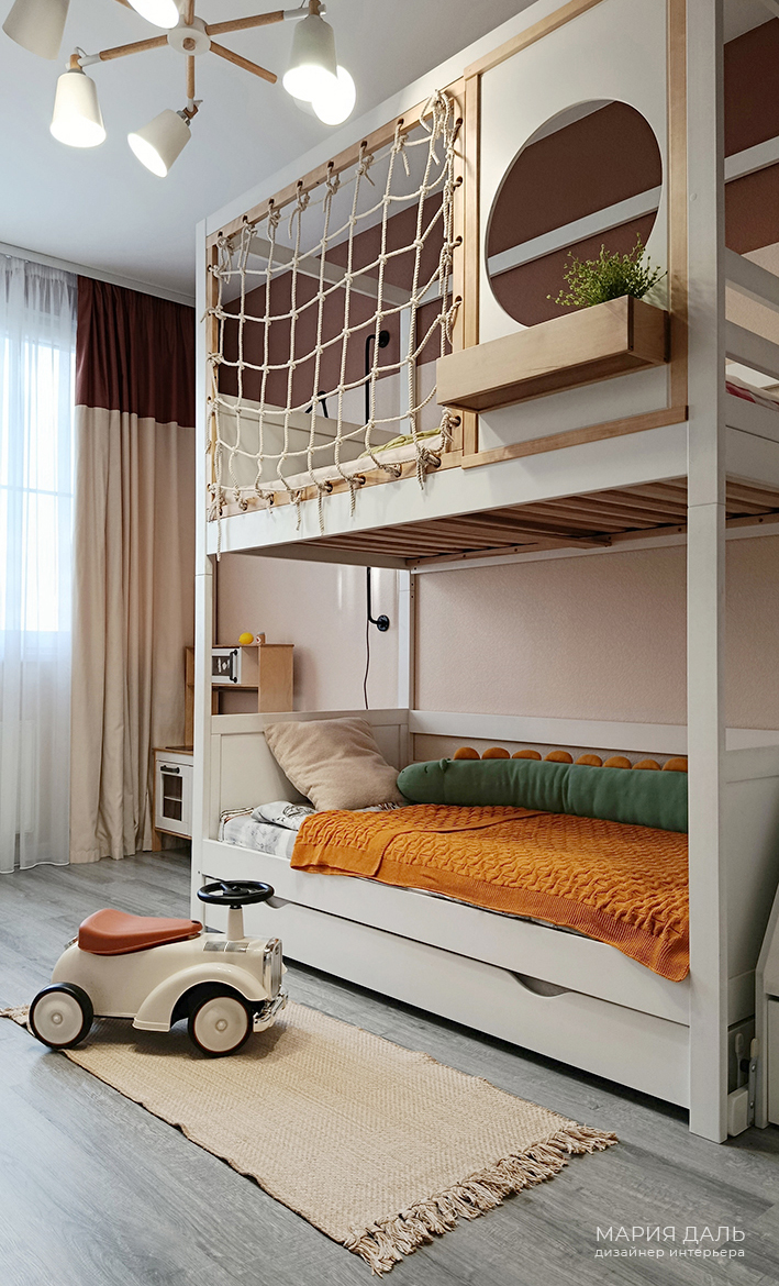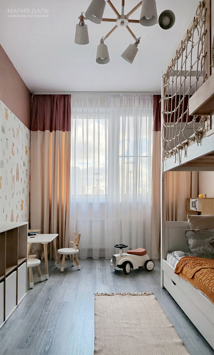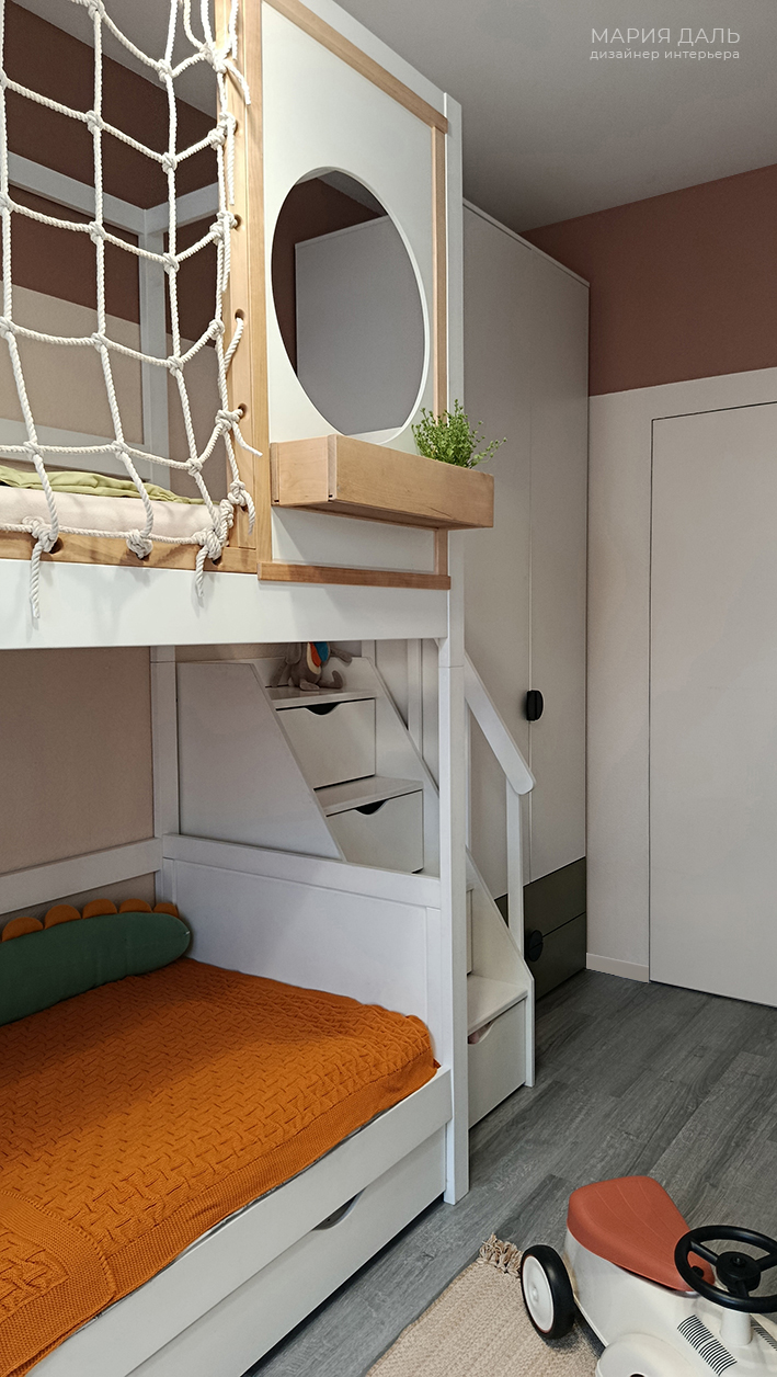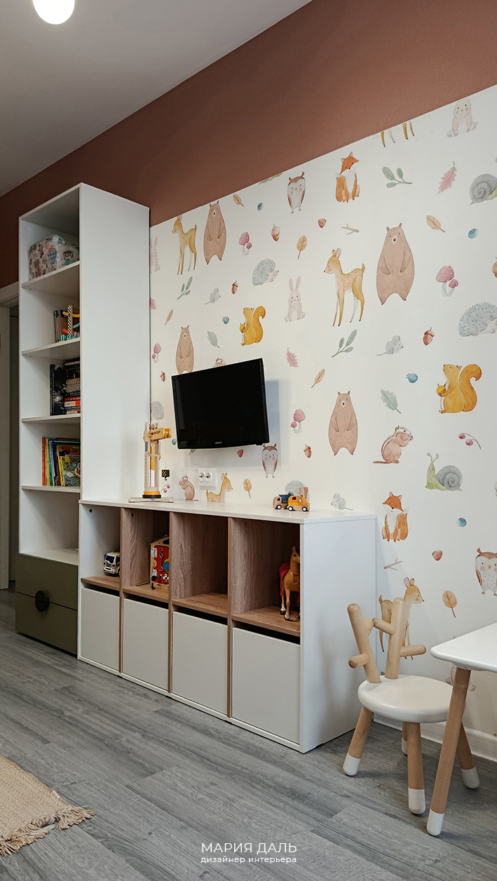 В детской комнате, верхняя часть стены покрашена в терракотовый цвет, а нижняя часть стены обклеина милыми обоями. Подобрана детская корпусная качественная мебель, удобные системы хранения и двухъярусная кровать.