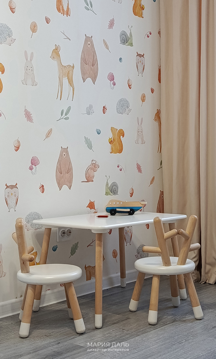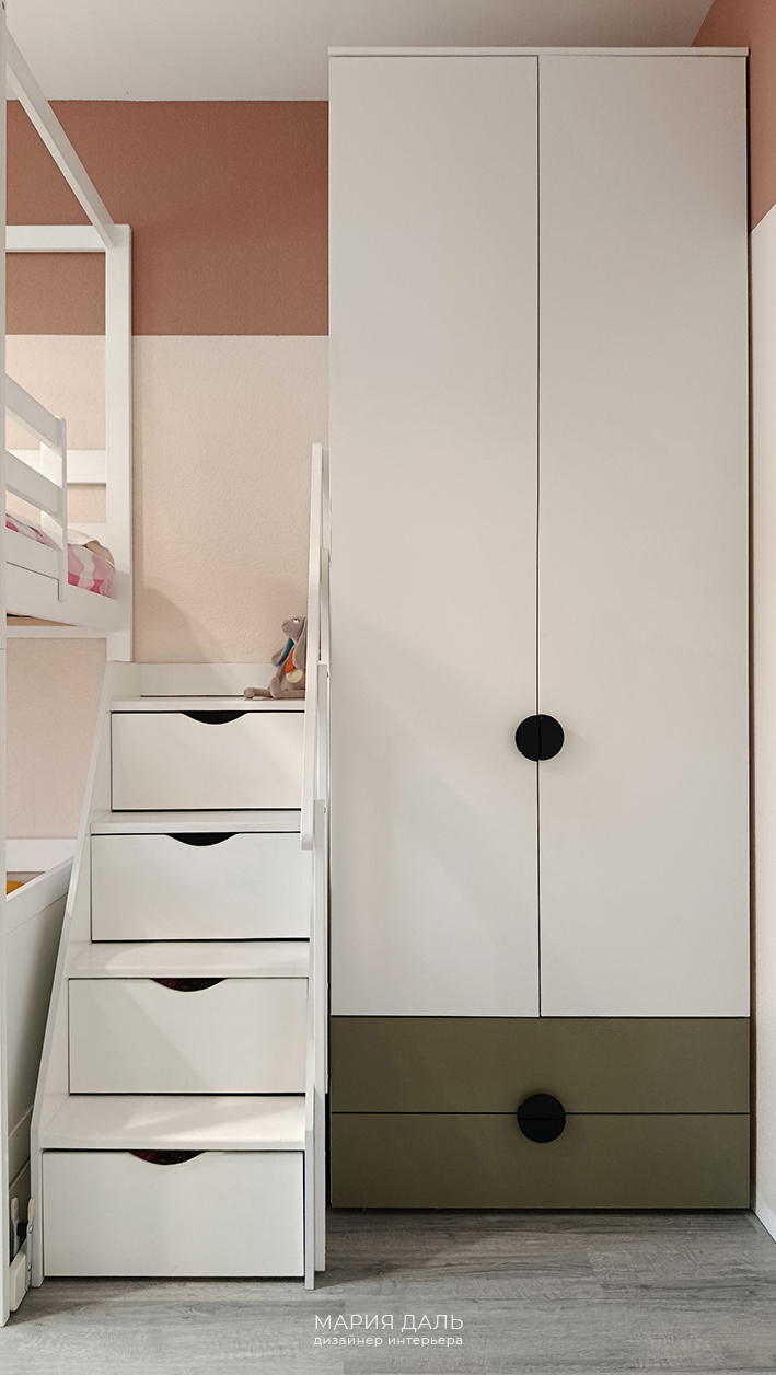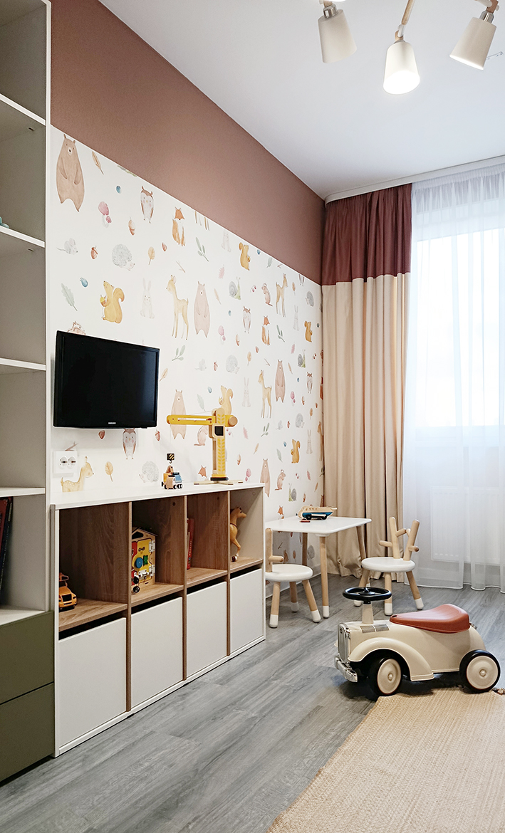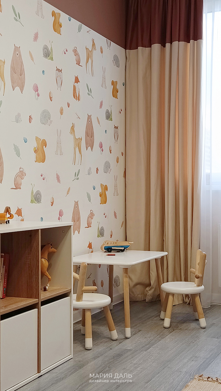 В детской комнате, верхняя часть стены покрашена в терракотовый цвет, а нижняя часть стены обклеина милыми обоями. Подобрана детская корпусная качественная мебель, удобные системы хранения и двухъярусная кровать.