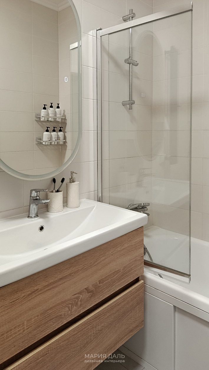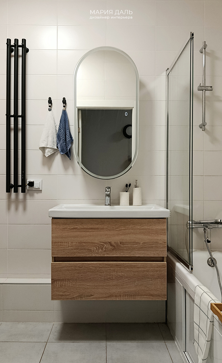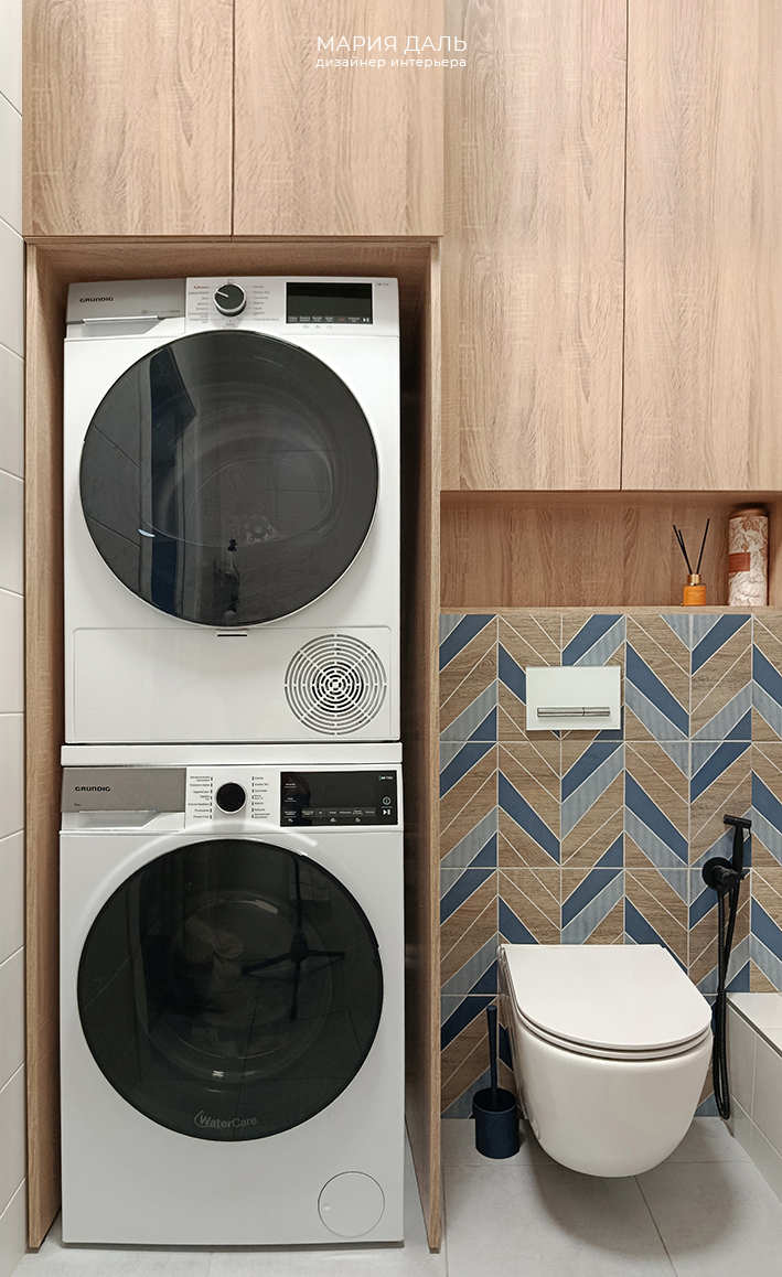 В ванной комнате оставили плитку на стенах от Застройщика, но изменили расположение унитаза, и достроили короб с инсталяцией, подобрали для него новую плитку. Проработан и заказан шкаф под стиральную и сушильную машину.