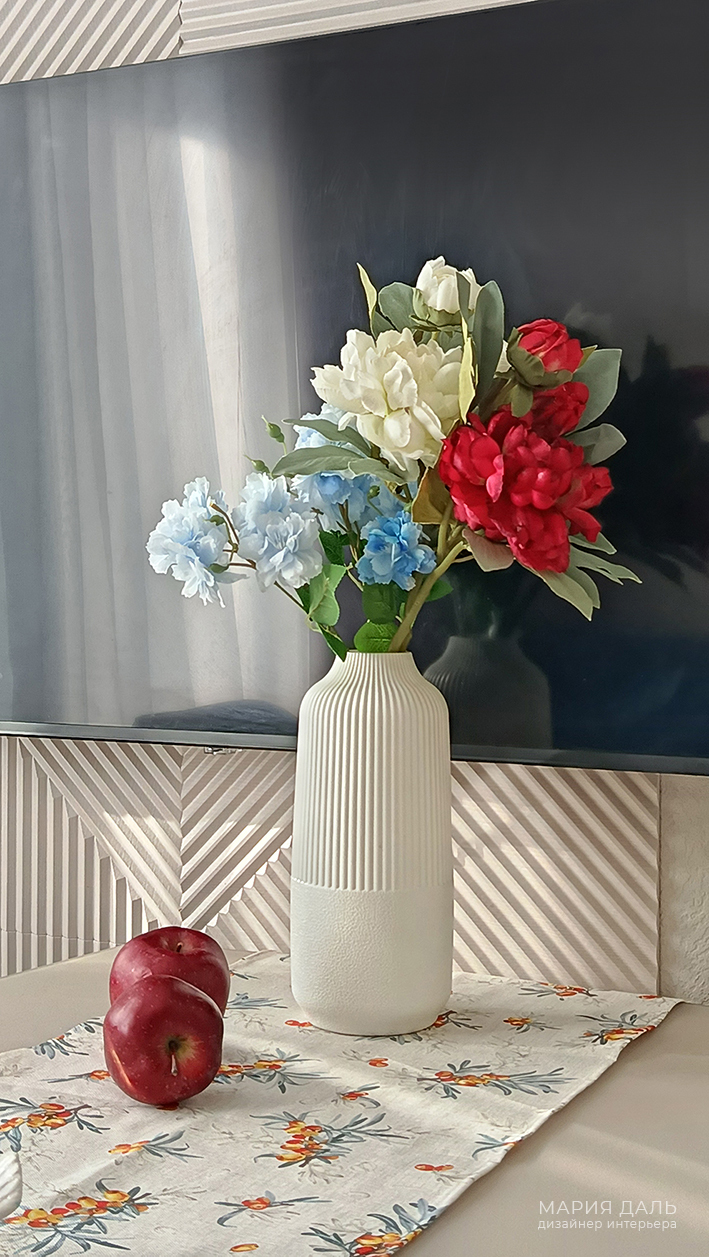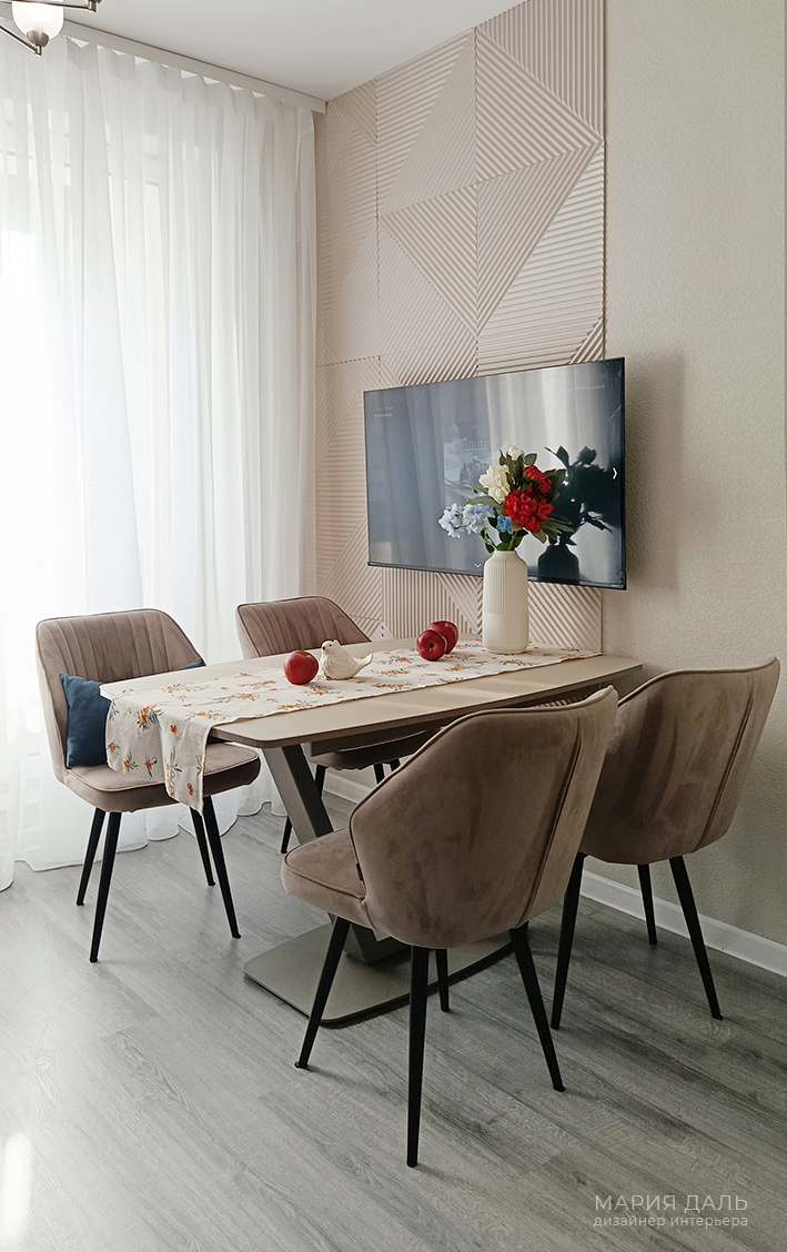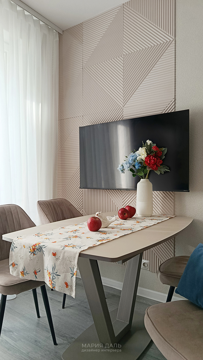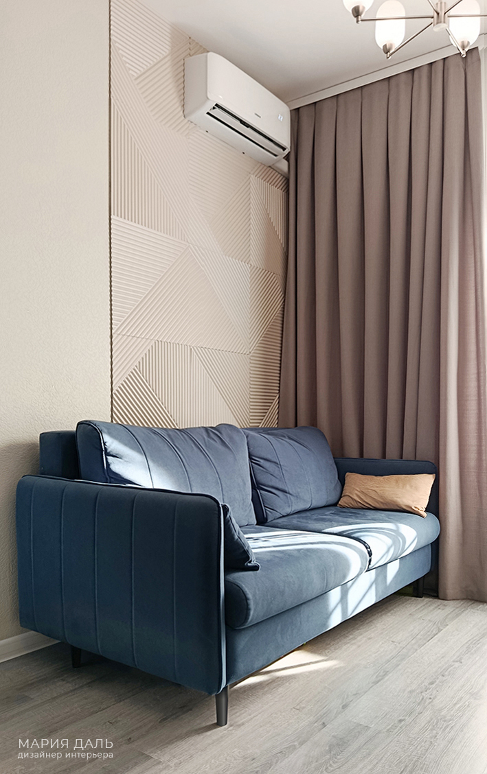 В зоне гостиной, на стены подобраны декоративные стеновые панели.