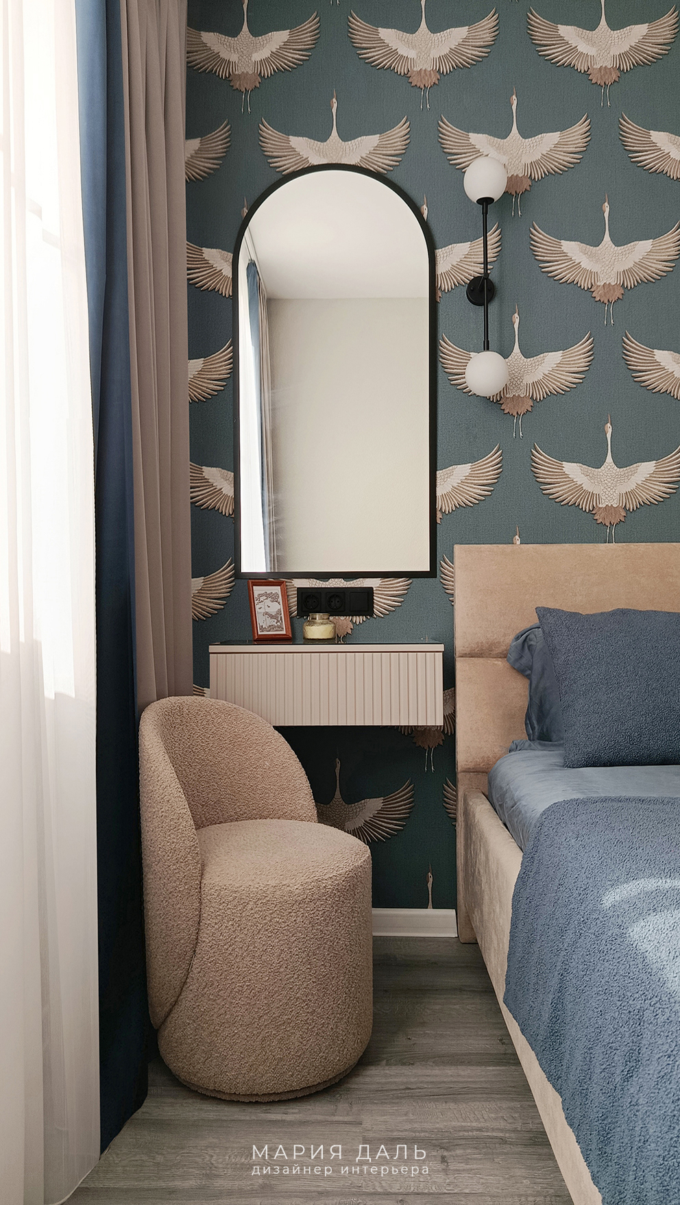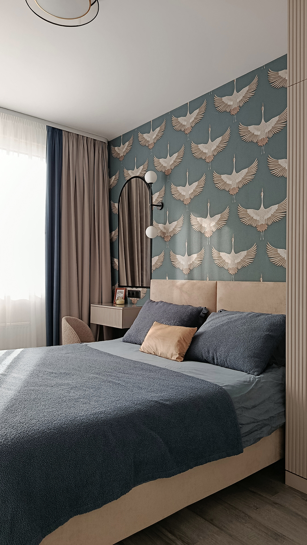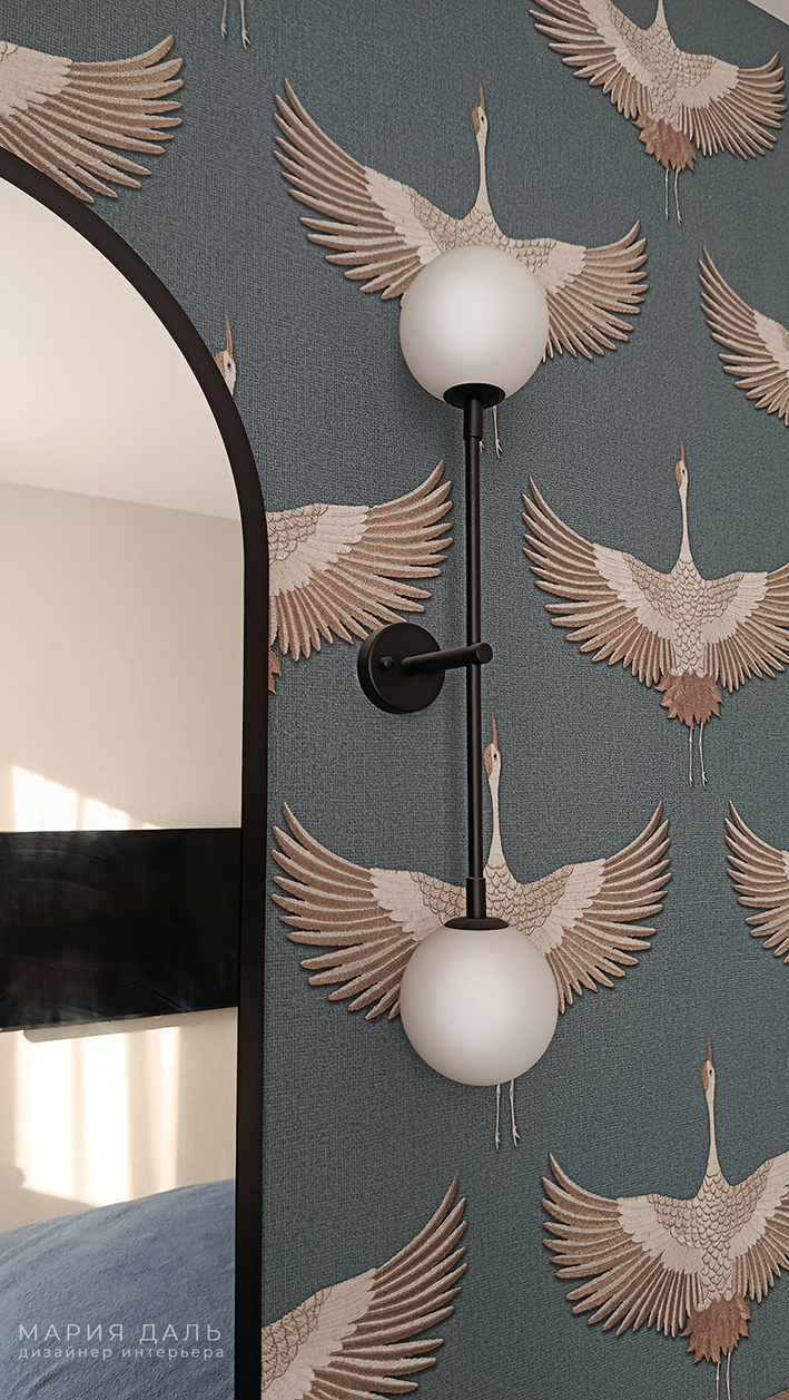 В спальне, за изголовьем кровати, обновлена стена с акцентными обоями. Обустроено место для макияжа и небольшого гардеробного шкафа.