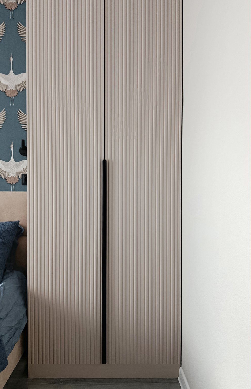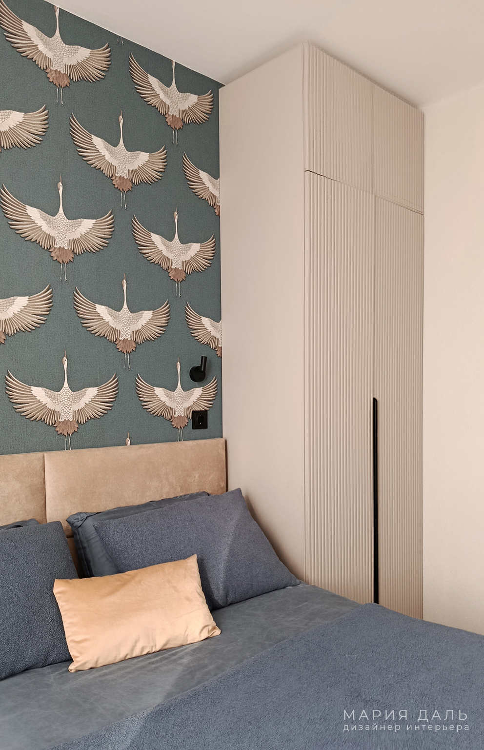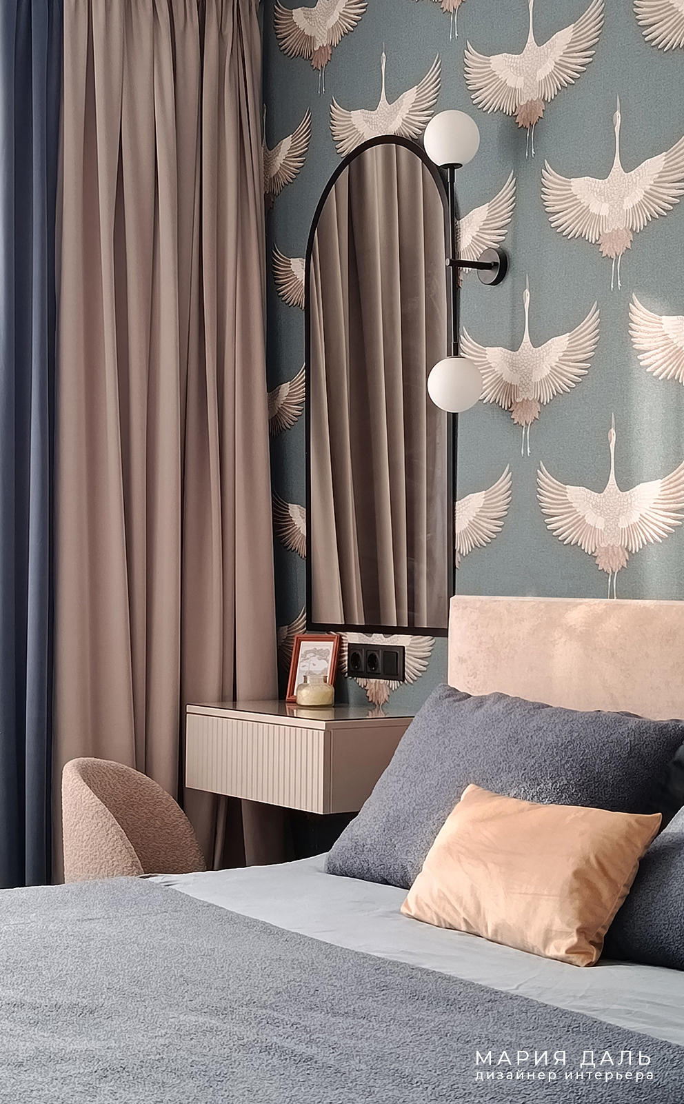 В спальне, за изголовьем кровати, обновлена стена с акцентными обоями. Обустроено место для макияжа и небольшого гардеробного шкафа.