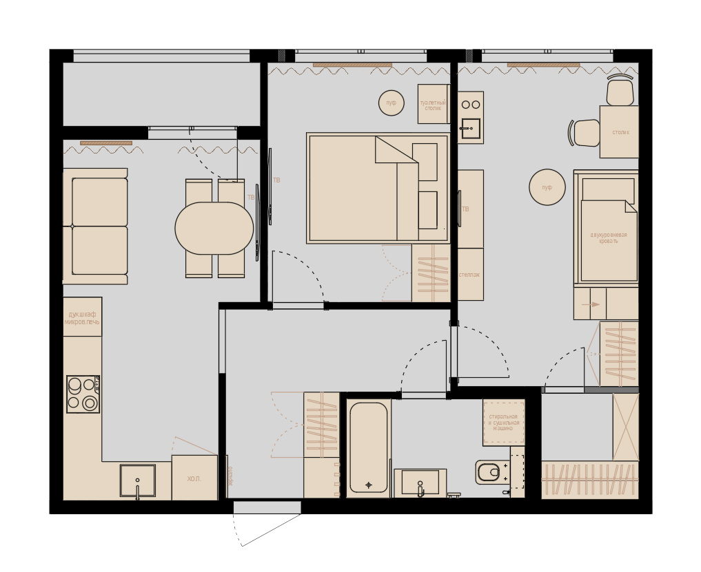 Изначально был проработан план с расстановкой мебели. В виде коллажей разработана будущая стилистика интерьера, подобрана вся мебель, освещение, проработан кухонный гарнитур и заказная мебель в ванной комнате.
