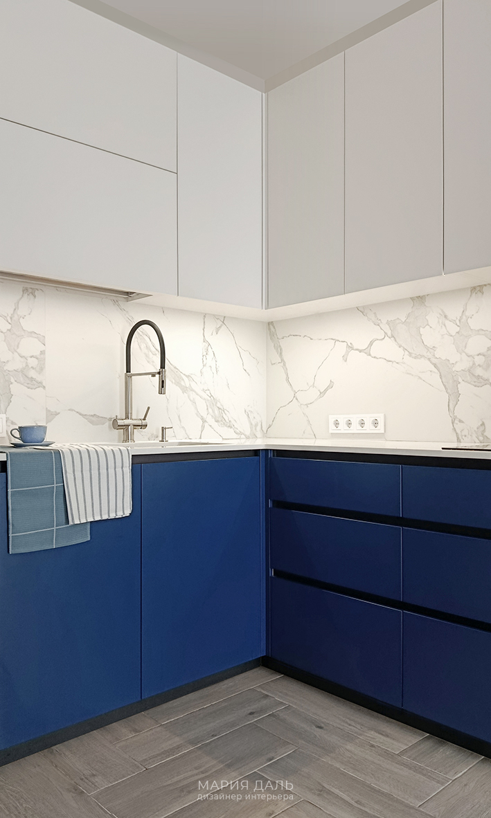 В коридоре и в зоне кухни ламинат частично заменили на плитку. Покрасили стены. Остановились на сочетании бежевой и синей цветовой гамме.
